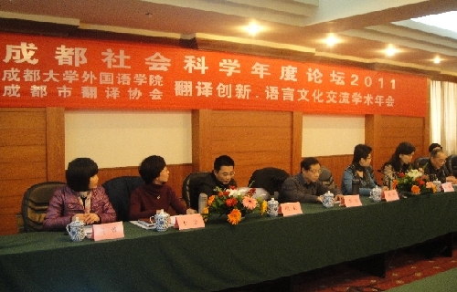 为了贯彻落实十七届六中全会精神,推进成都文化大发展大繁荣,2011年12月,中共成都市委宣传部、成都市社会科学联合会举办了为期一个月的“成都社会科学年度论坛”。论坛期间,成都翻译协会与成都大学外国语学院、西南财经大学经贸外语学院、西南民族大学外国语学院、成都语言家翻译社等单位先后共同组织了8场系列学术活动,是成都市社团中开展次数最多、质量高、效果最好的社团之一。这些活动分别是:12月12日、14日、25日在西南财经大学经贸外语学院举行的有关翻译方面的“妇女问题研究——以美国为例”研讨会、“英语文学中的撒旦似人物研讨会”、“东方与西方:西方宗教在魏晋时期的传播研讨会”、“外国文学研究”研讨会;12月5日邀请四川大学博士生导师、成都翻译协会副会长曹明伦在西南民族大学外国语学院作的题为“发扬‘一名之力、旬月踟蹰’的精神——从三部美国电影片名之汉译说起”学术讲座;12月18日与语言家翻译社共同举办的“翻译创新与文化发展学术交流暨成都翻译协会语言家翻译社年会”;12月20日在成都大学外国语学院召开的“翻译创新与语言文化交流”研讨会。