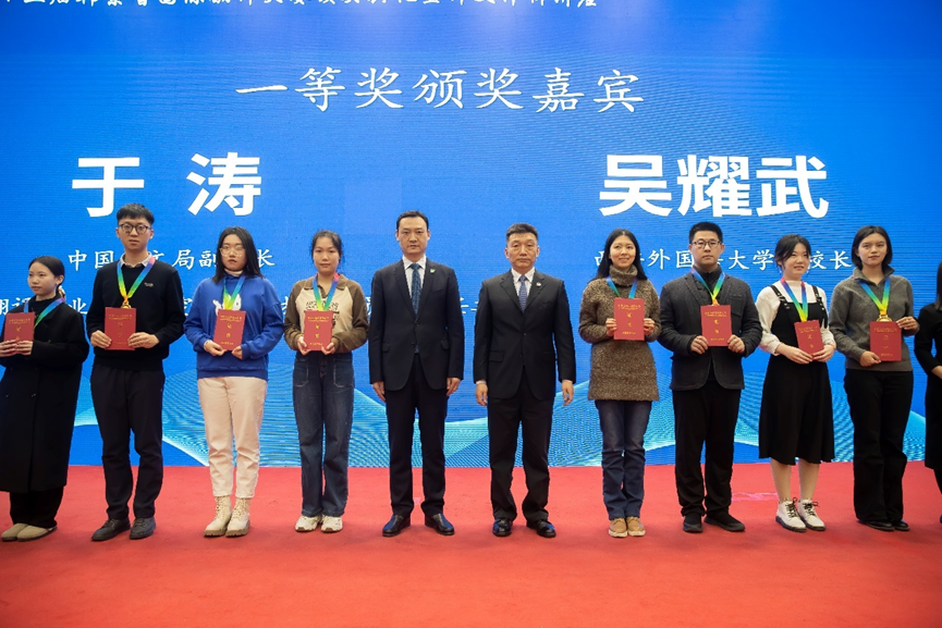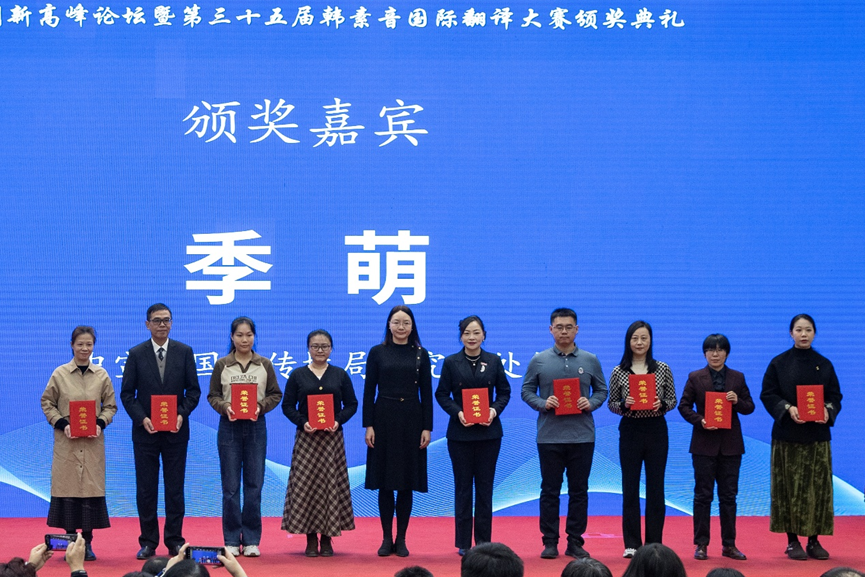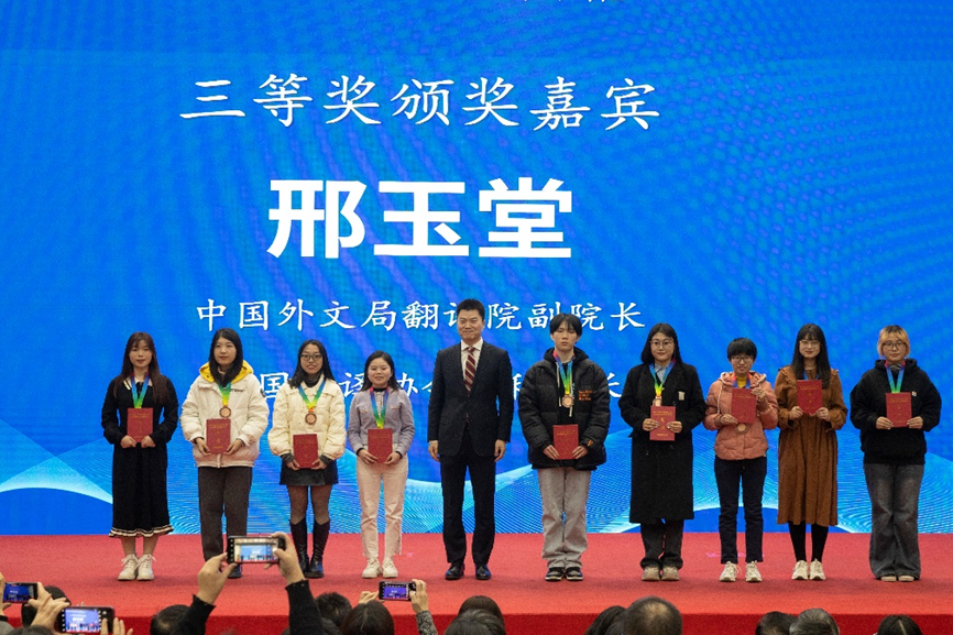 中国外文局翻译院副院长、中国翻译协会副秘书长邢玉堂为三等奖获奖代表颁发奖章和证书
