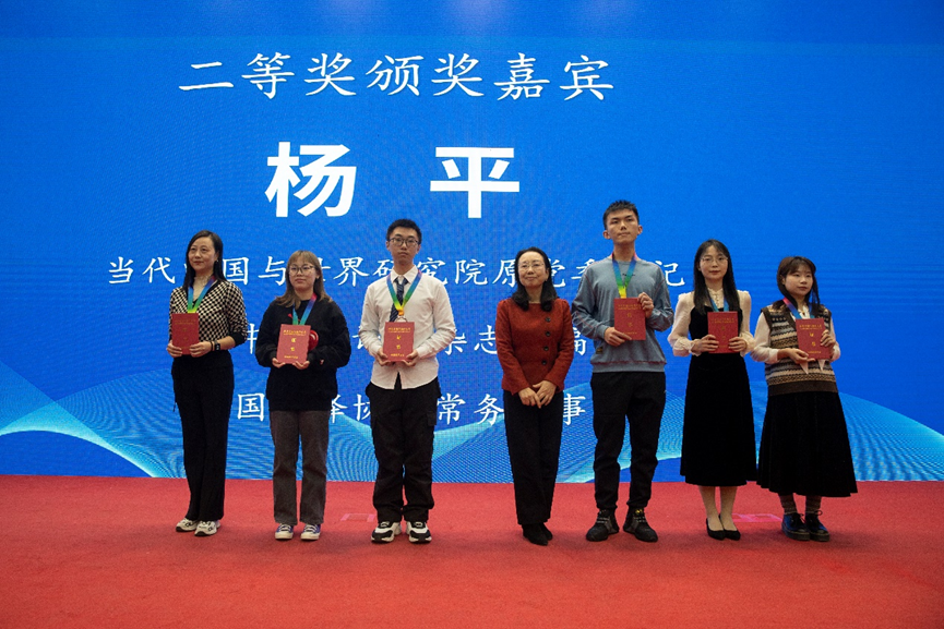 当代中国与世界研究院原党委书记、《中国翻译》杂志主编杨平为二等奖获奖代表颁发奖章和证书