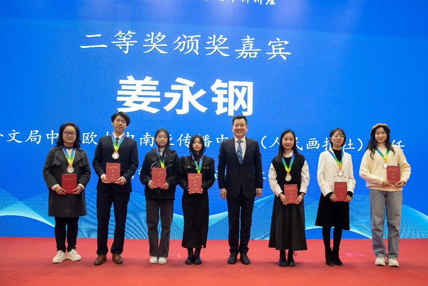 中国外文局中东欧与中南亚传播中心(人民画报社)主任、中国翻译协会副会长姜永钢为二等奖获奖代表颁发奖章和证书