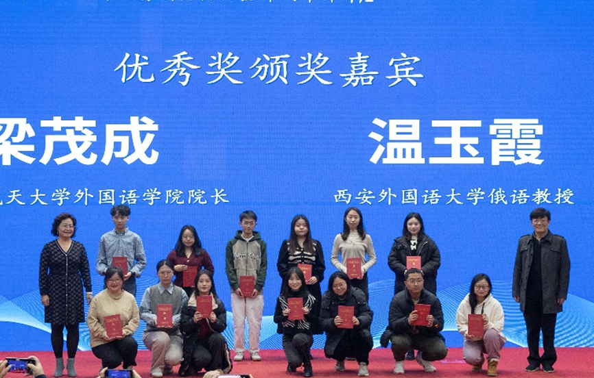 北京航空航天大学外国语学院院长梁茂成、西安外国语大学俄语教授温玉霞为优秀奖获奖代表颁发证书