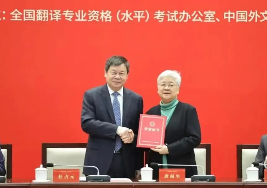 杜占元为翻译资格考试顾问唐闻生颁发荣誉证书