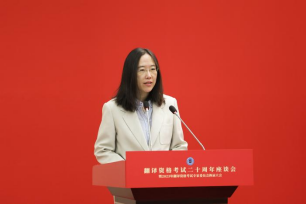 黄友义、史明德和中国外文局翻译院翻译专家工作部兼翻译资格考试部主任李萌,优秀考生代表、中冶东方翻译中心主任赵忠会分别发言?;朴岩迦衔胱矢窨际栽诜肴瞬叛“喂ぷ髦蟹⒒恿酥匾饔?,推动了翻译人才队伍专业化建设,为翻译教育更好服务国家发展战略大局起到了引导和促进作用。他指出,翻译资格考试未来发展任重道远,要精益求精,积极应对新形势新挑战,在国家翻译能力建设中发挥独特作用。史明德指出,新一届翻译资格考试专家委员会要坚持聚焦国家需求、服务国家大局,发挥理论研究优势,积极推动考试科学化发展,同时要树立底线思维,增强保密意识和安全意识,把翻译资格考试打造成权威、高效、安全,让党和人民放心满意的模范品牌考试。李萌表示,翻译资格考试的顺利推出和发展壮大,离不开专家委员会专家与考生的大力支持。近年来,翻译资格考试依托技术应用,不断提升考试组织管理现代化水平,有效推动考试实现新发展。赵忠会表示,翻译资格考试逐渐成为衡量译员能力和水平的重要标准,为行业遴选了大批人才,为翻译事业发展提供了坚实人才支撑,有效推动了翻译行业规范发展。