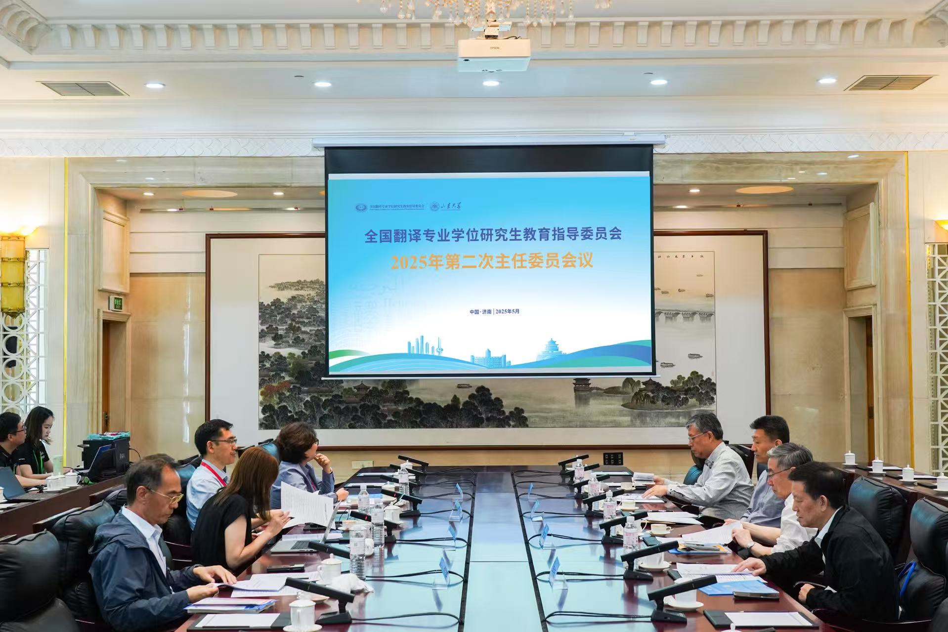 5月17日,全国翻译专业学位研究生教育指导委员会(以下简称“教指委”)2025年第二次主任委员会议在山东济南召开。中国外文局副局长、教指委主任委员于涛出席并主持会议。上海外国语大学原党委书记姜锋、中国外文局人事部主任杨建平、湖南师范大学原党委书记蒋洪新、北京外国语大学高翻学院院长任文、广东外语外贸大学翻译学研究中心主任赵军峰等副主任委员,上海外国语大学高翻学院院长、教指委秘书长张爱玲出席会议,中国外文局原副局长兼总编辑、教指委专家委员会主任黄友义列席会议。