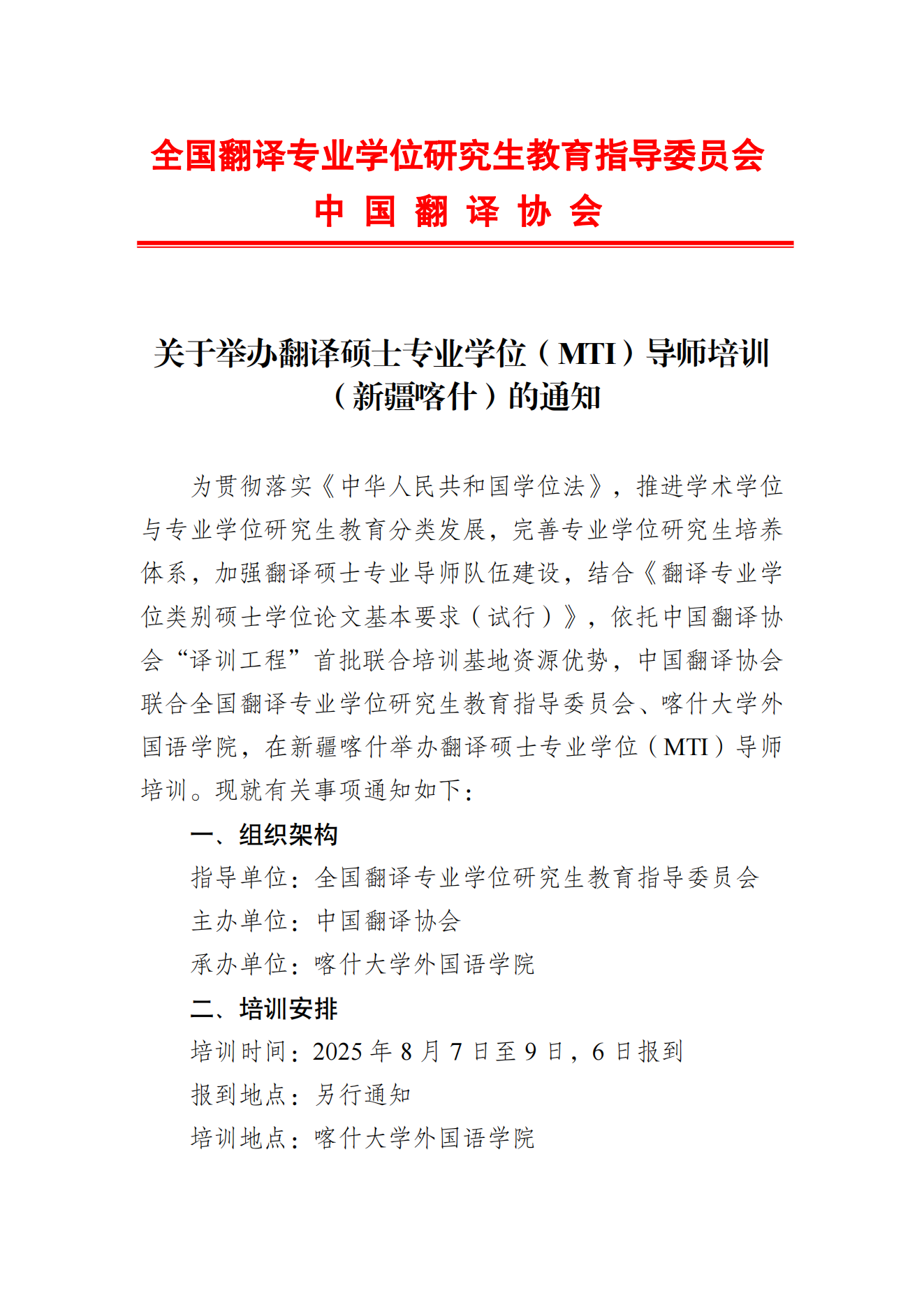 关于举办翻译硕士专业学位(MTI)导师培训(新疆喀什)的通知