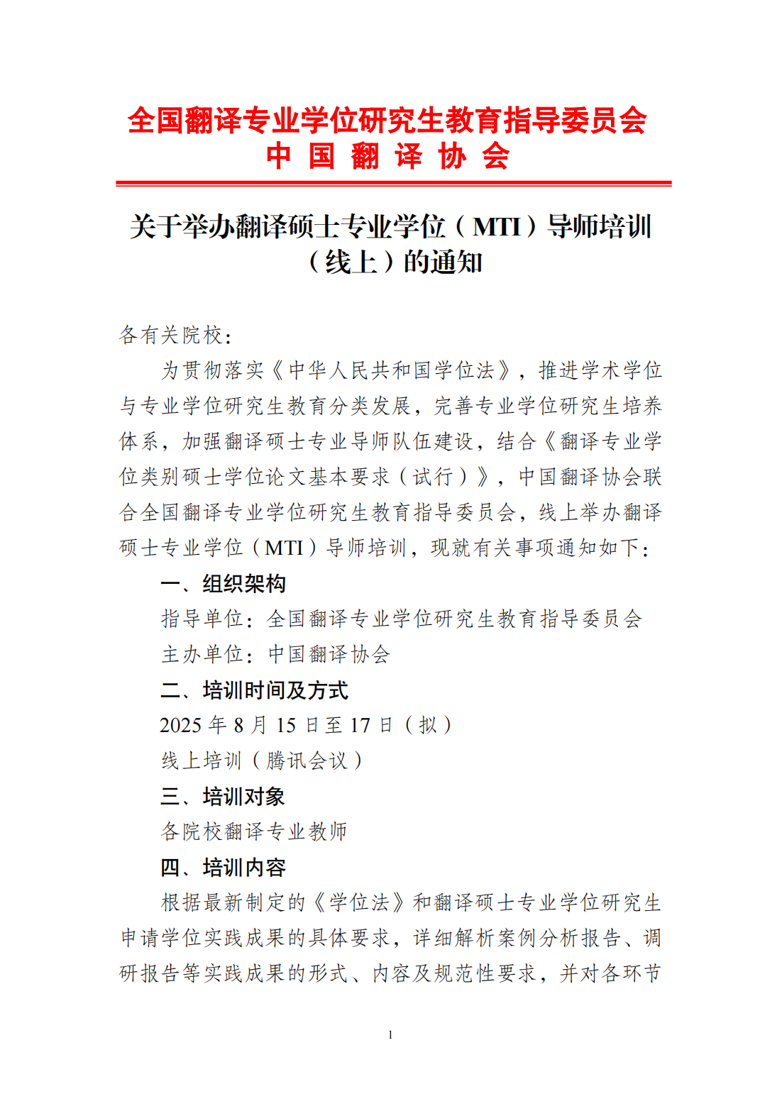 关于举办翻译硕士专业学位(MTI)导师培训(线上)的通知