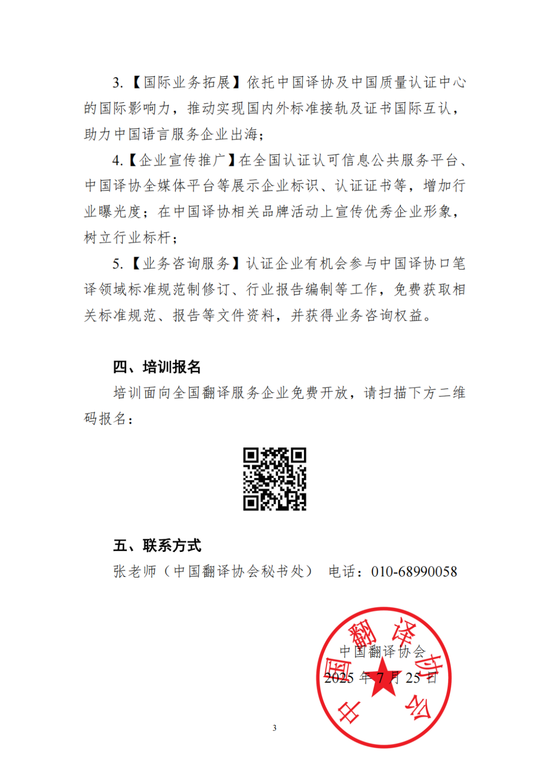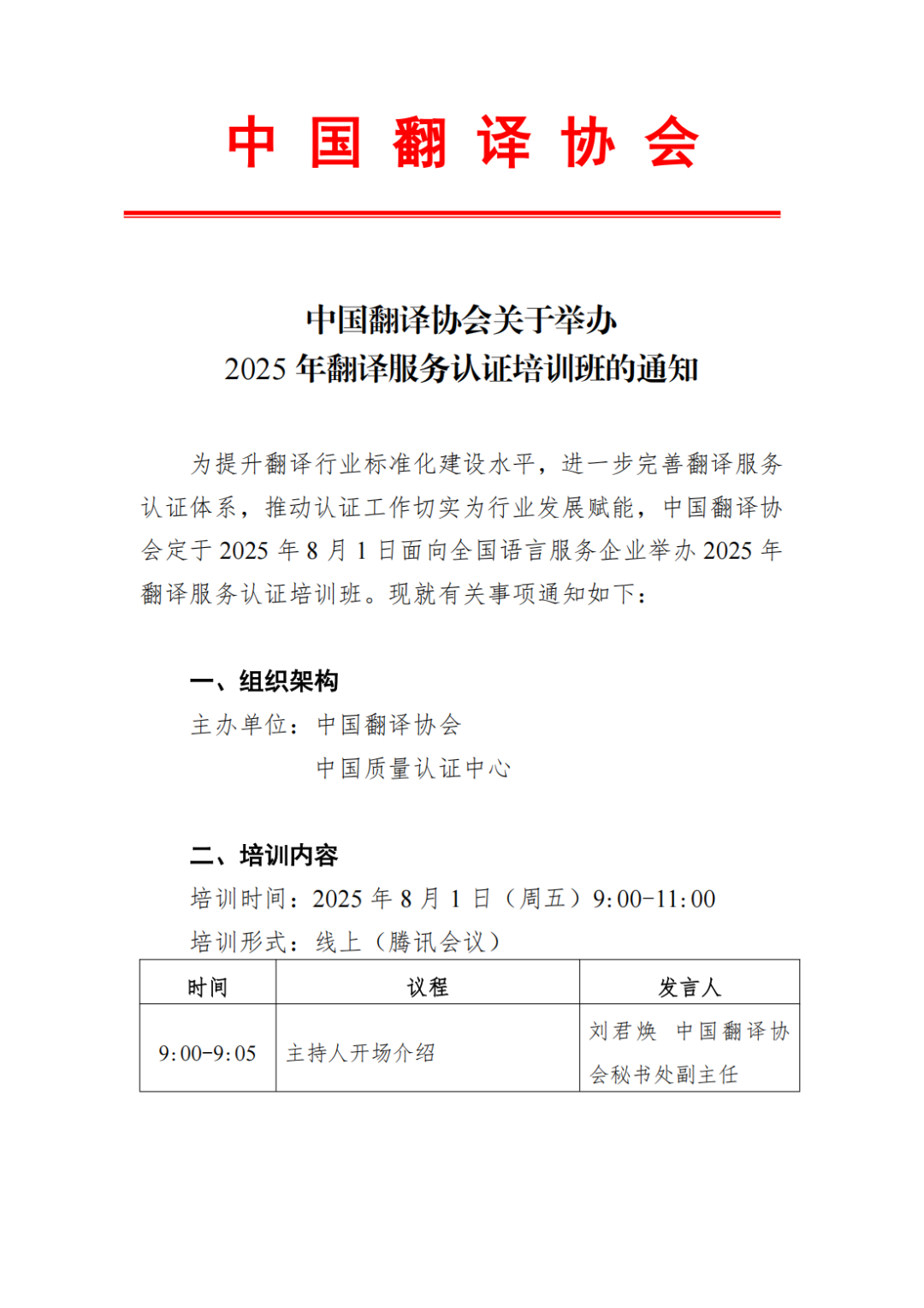中国翻译协会关于举办2025 年翻译服务认证培训班的通知